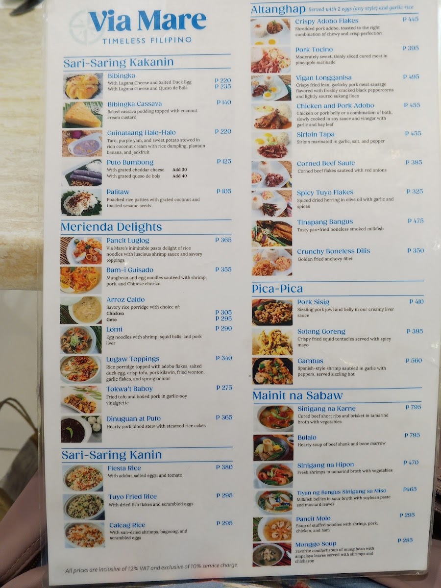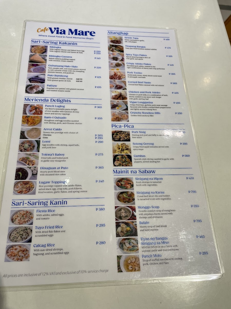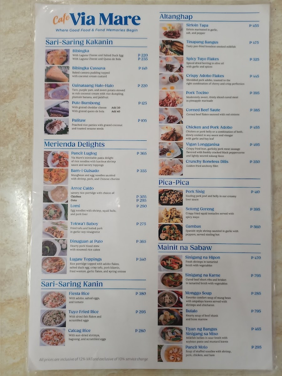 The menu at Cafe Via Mare offers a delightful range of Filipino dishes, each showcasing the rich flavors and traditions of Filipino cuisine. A standout is Puto Bumbong, a popular Filipino delicacy made from steamed rice cakes, typically served during the Christmas season. The Pancit Luglug is another classic, featuring a rich noodle dish topped with shrimp, hard-boiled eggs, and a savory sauce. For a sweet treat, Guinumis and Ginataang Halo Halo offer a refreshing, coconut milk-based dessert perfect for any time of day.