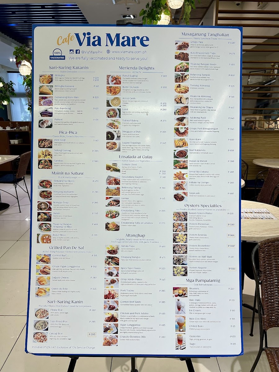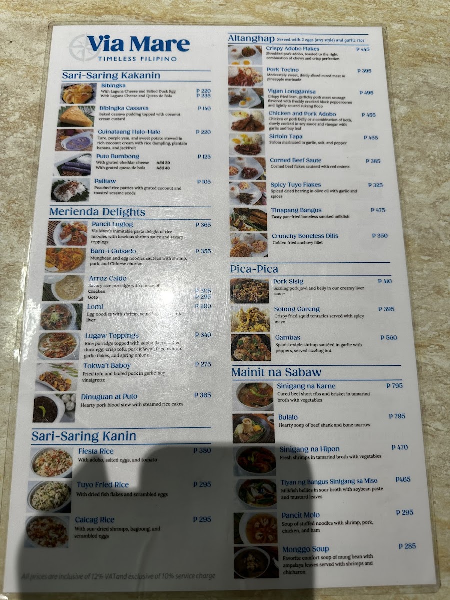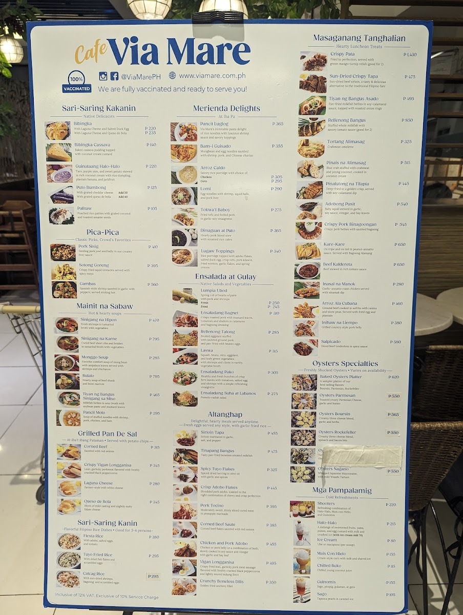 The menu at Cafe Via Mare offers a delightful range of Filipino dishes, each showcasing the rich flavors and traditions of Filipino cuisine. A standout is Puto Bumbong, a popular Filipino delicacy made from steamed rice cakes, typically served during the Christmas season. The Pancit Luglug is another classic, featuring a rich noodle dish topped with shrimp, hard-boiled eggs, and a savory sauce. For a sweet treat, Guinumis and Ginataang Halo Halo offer a refreshing, coconut milk-based dessert perfect for any time of day.
